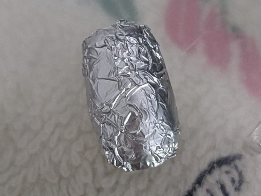 2.アルミホイルを巻いたネイルチップに1を押し付ける