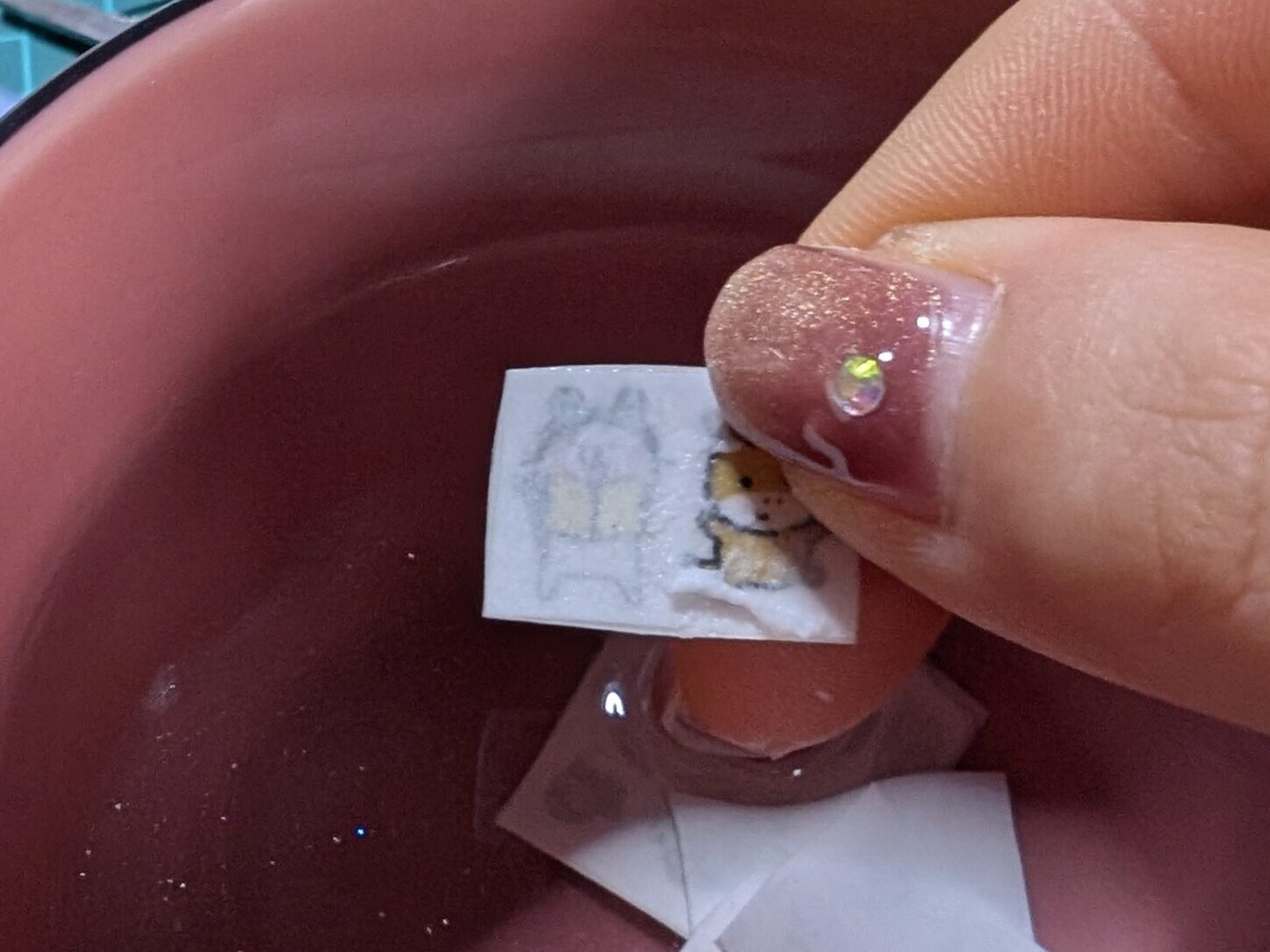 両面テープに画像を貼り付けて、ぬるま湯に10分浸します→ふやけた紙を指で取り除きます