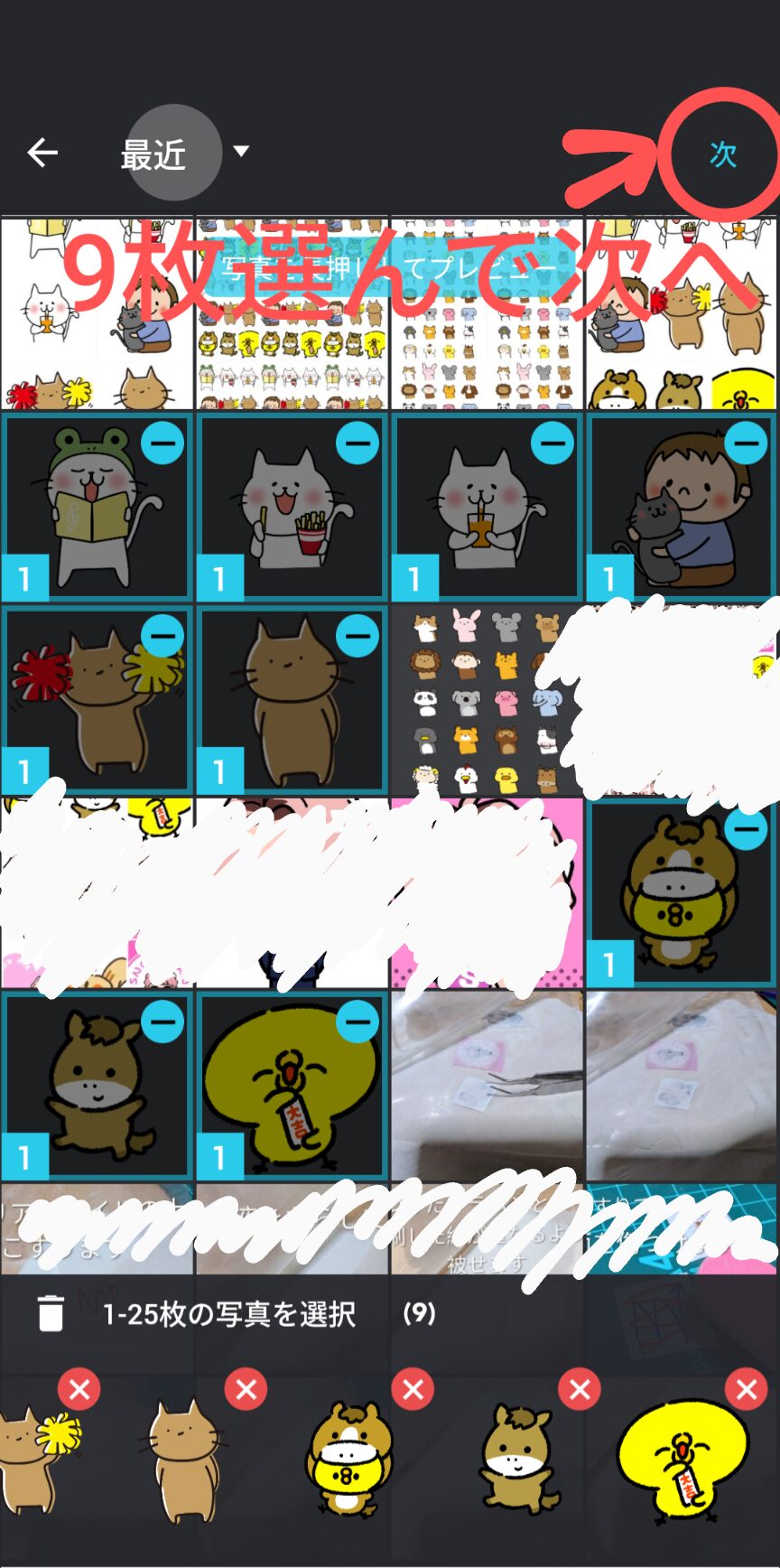 2.爪にのせたい画像を9個選んで、次へ
