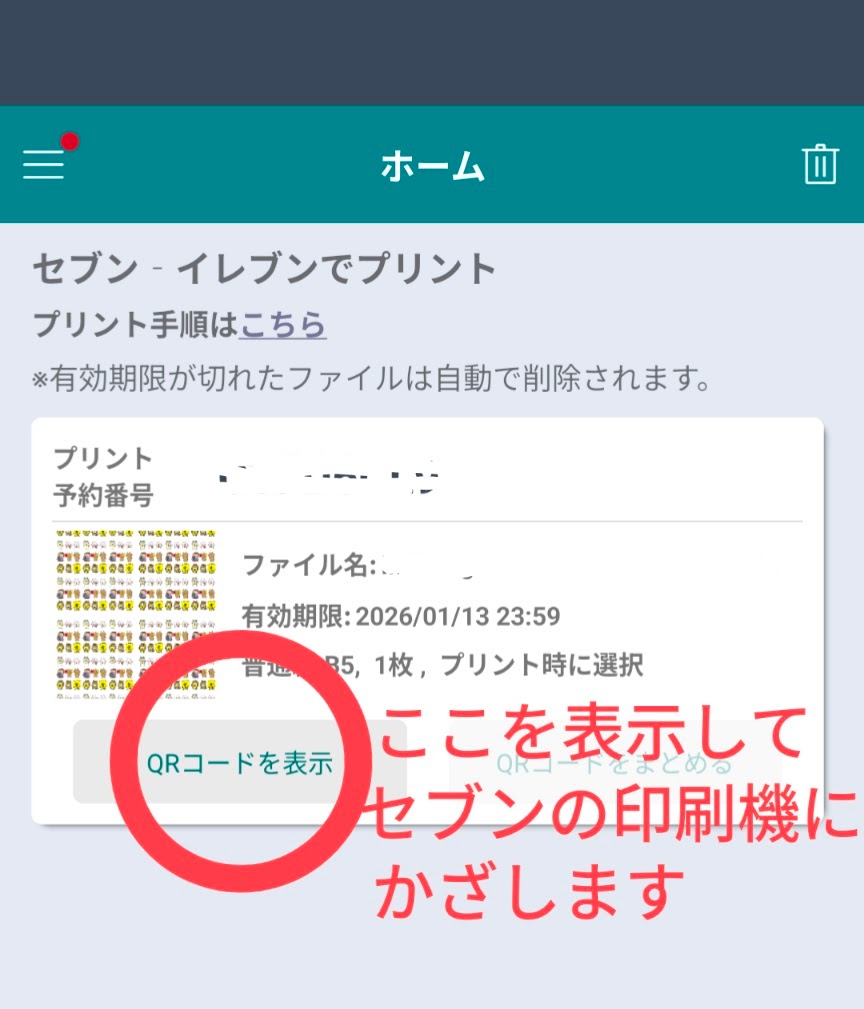 セブンのコピー機にQRコードをかざすところがあるので、そこにかざせば印刷できますよ!