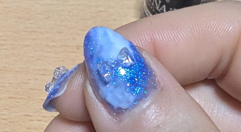 実際にピールオフジェルを土台に塗ってパーツを付けましたが、うまくはがれませんでした、、
