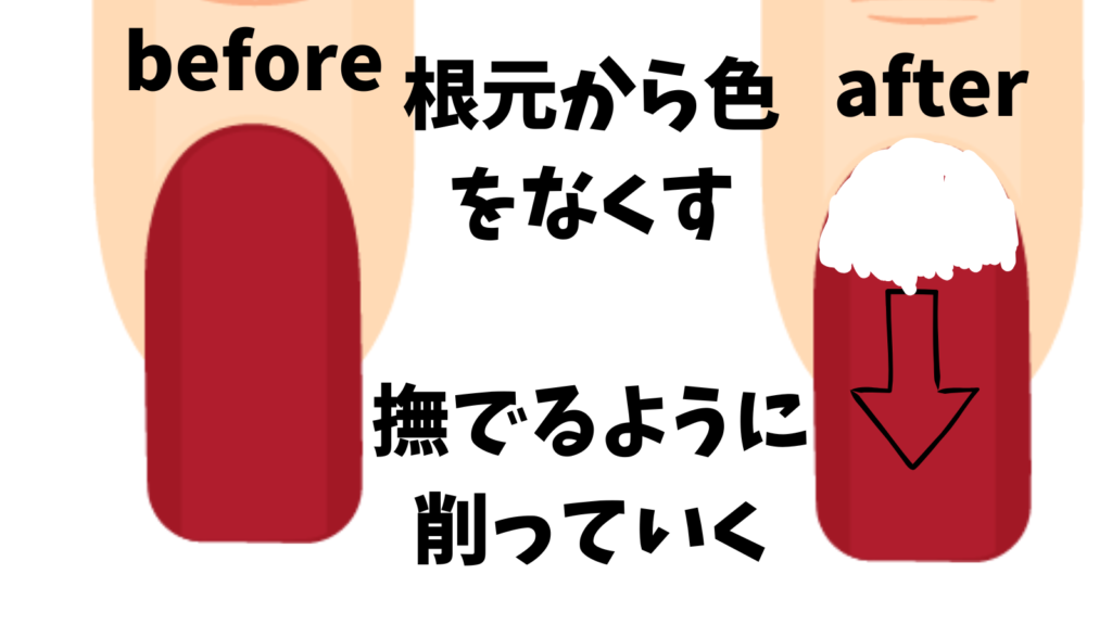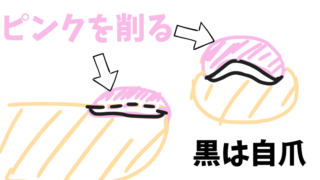カラーが削れて透明になったら、爪の厚さを見ながら削っていきます