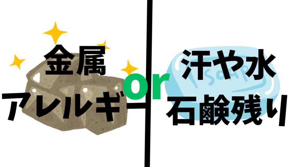 金属アレルギーか、汗・水・石鹸残りによる刺激の、2パターンが考えられます。
